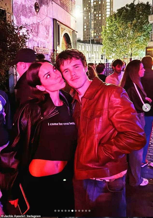 In one photo, Jackie rocked a cropped T-shirt which said: ‘I came for Cruz Beckham’ as she cosied up to the 20-year-old.