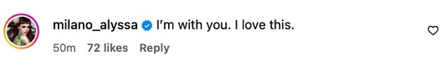 Actress Alyssa Milano wrote, ‘I’m with you. I love this.’