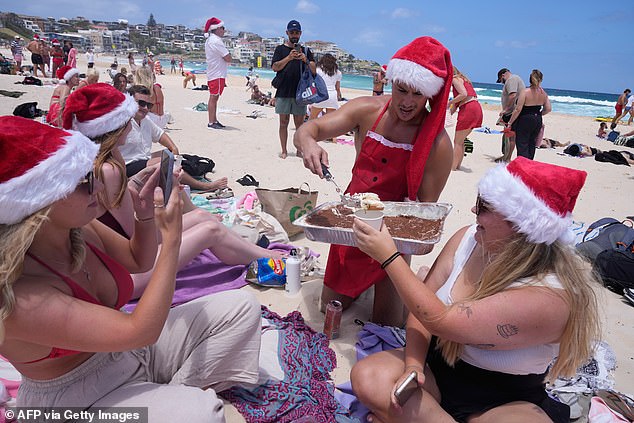 One of Australia’s most famous beaches has been painted a festive red as thousands of revellers dressed in Christmas-themed outfits swarmed to the seaside to celebrate the public holiday.