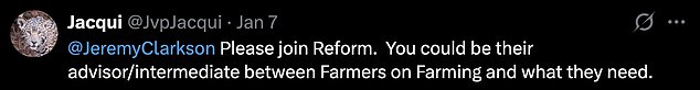 One X user replied under the video: ‘Please join Reform. You could be their advisor/intermediate between Farmers on Farming and what they need.’