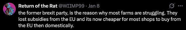 A second disagreed: ‘The former Brexit party is the reason why most farms are struggling. They lost subsidies from the EU and its now cheaper for most shops to buy from the EU then domestically.’