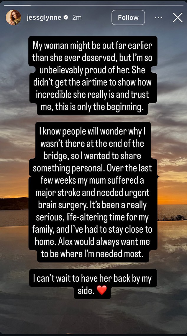 Jess explained her mother’s illness was a ‘life-altering time’ for her family and that Alex ‘would always want me to be where I’m needed most’ as she supported her girlfriend of two years