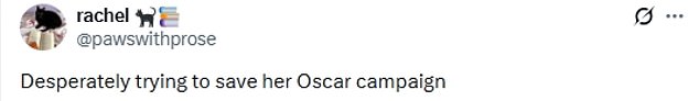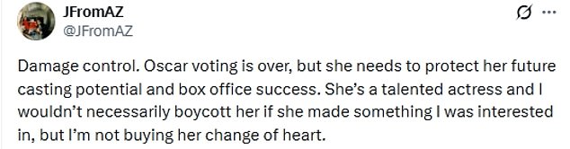 They wrote: ‘Damage control. Oscar voting is over, but she needs to protect her future casting potential and box office success. She’s a talented actress and I wouldn’t necessarily boycott her if she made something I was interested in, but I’m not buying her change of heart,’;