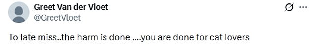‘not the damage control [crying face],’; ‘To late miss..the harm is done ….you are done for cat lovers,’;