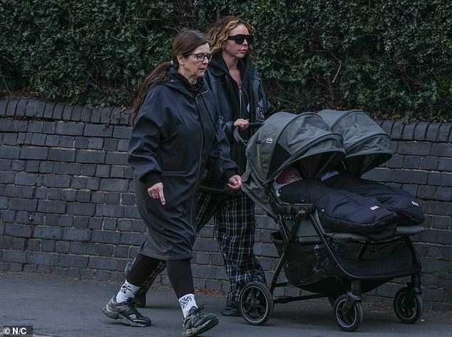 The star pushed her twins along in a double pram as she headed out for a stroll with her mother