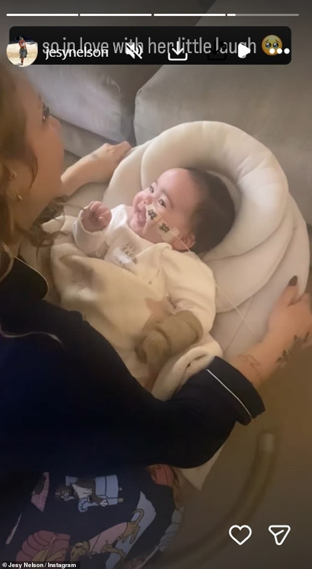 In the clip, Jesy coos at her daughter who squeels and laughs in response while tucked up in a baby bouncer chair. Her daughters have feeding tubes in their noses to help clear their chests.
