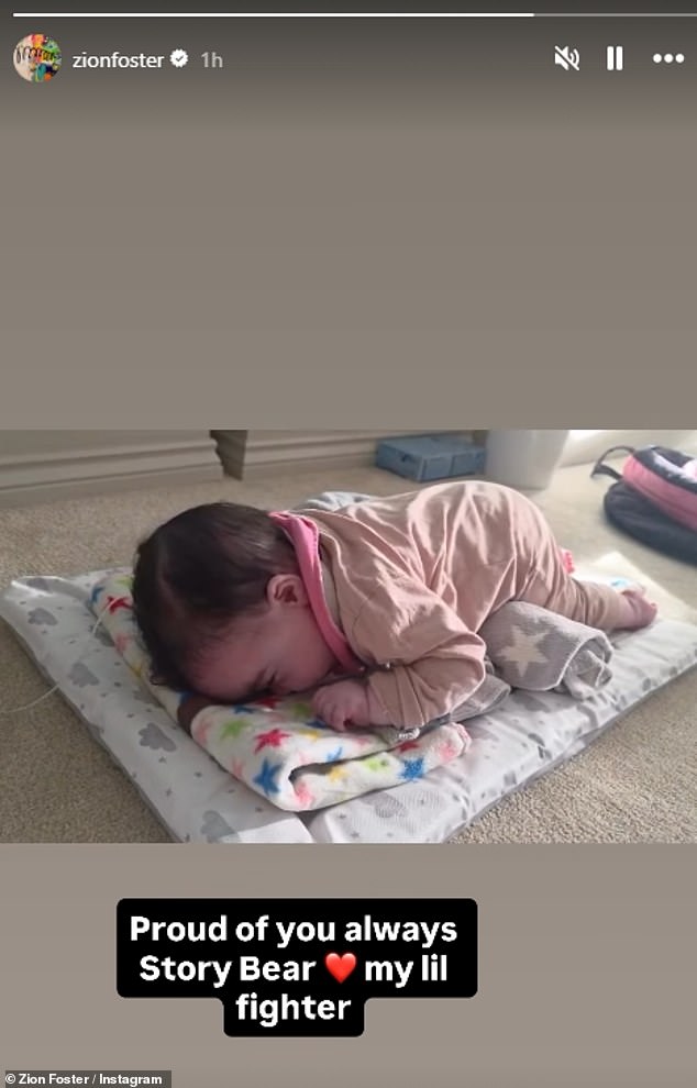Musician Zion, 27, wrote on Instagram on Tuesday: ‘Proud of you always Story Bear. My lil fighter’ as his little girl wriggled around