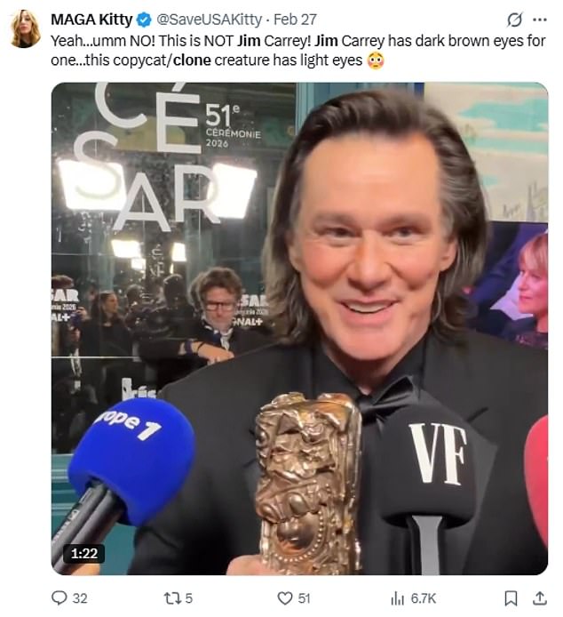 Another added: ‘Yeah…umm NO! This is NOT Jim Carrey! Jim Carrey has dark brown eyes for one…this copycat/clone creature has light eyes.’