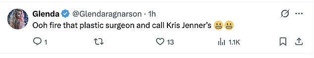 A few went for the jugular, referencing Kris Jenner’s recent facelift at 70: ‘Ooh, fire that plastic surgeon and call Kris Jenner’s,’ one wrote.