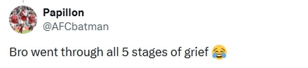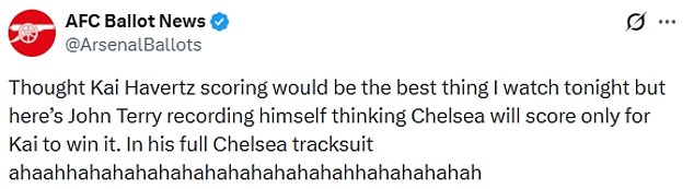 Arsenal fans milked Terry’s pain, with one sharing the video and writing: ‘Thought Kai Havertz scoring would be the best thing I watch tonight but here’s John Terry recording himself thinking Chelsea will score only for Kai to win it. In his full Chelsea tracksuit ahaahhahahahahahahahahahahahahhahahahahah.’