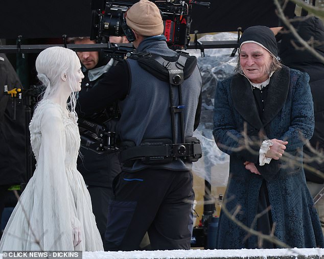 The Hollywood star looked almost unrecognisable in his full Victorian get-up as he cracked a smile between takes alongside Andrea Riseborough, who plays the Ghost of Christmas Past