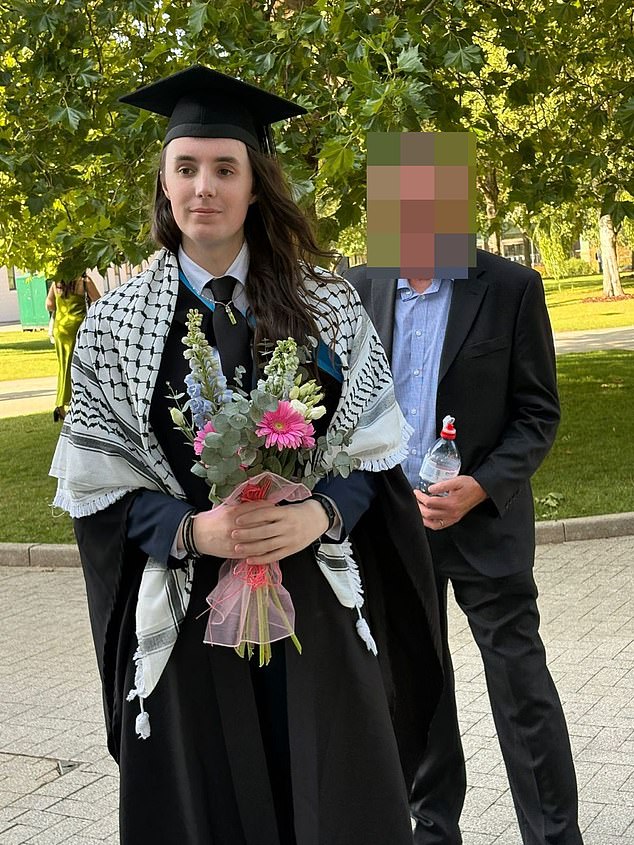 The activist graduated with a degree in cyber security from Warwick University last summer but caused a stir at the graduation ceremony by unfurling a trans flag bearing the words ‘free Palestine’.