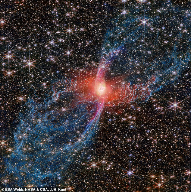 On the left, a previous image taken by the Hubble telescope shows thick orange clouds of dust forming a cross shape around the star. On the right, the new image reveals a strong red centre and blue loops of molecular gas, with thousands of stars in the background