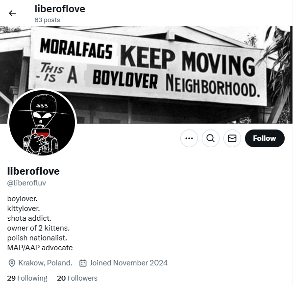 One Liber X account from December 2024 displayed pedophilic references such as “MAP” — an apparent nod to “minor attracted persons” — and “boylover,” an archived page shows. A post on the account complained about “anti-MAP discrimination” in response to the platform suspending yet another Liber account, “@liberoflove.”