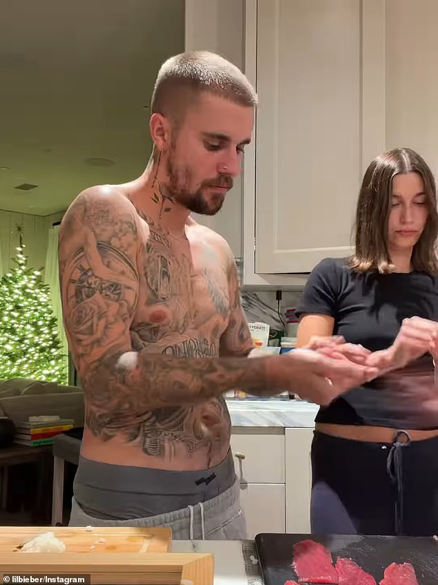 A shirtless Justin proceeded to make dinner with his wife, 29, by his side before eventually throwing on a simple long-sleeve top as they rolled their masterpieces into seaweed wrap.
