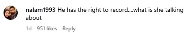 ‘He has the right to record….what is she talking about?’ another chimed in. ‘And… the insurance will also deny your claim,’ one woman wrote.
