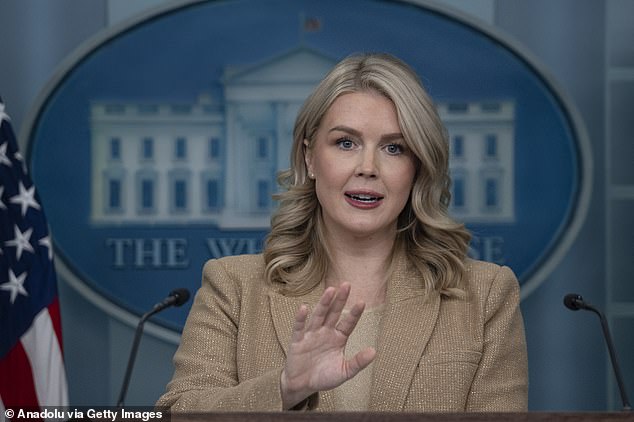 ‘I will point out one fake news story over the weekend before I let you all go from The New York Times, that took about one-third of the president’s daily calendar and his daily schedule and said that he’s doing less than he did in his first term, or he might not be fit for the job,’ Leavitt said.