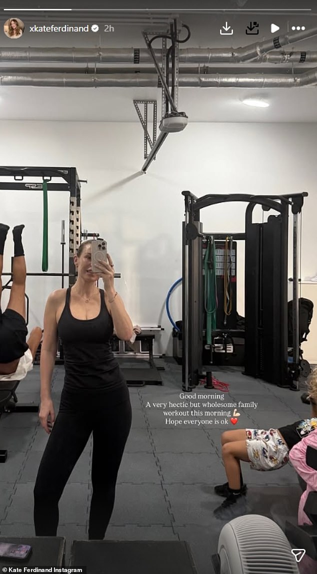 Kate Ferdinand has given a glimpse of her family’s underground Dubai bunker as they worked out in their basement gym on Tuesday while tensions remain high in the UAE after missile strikes by Iran.