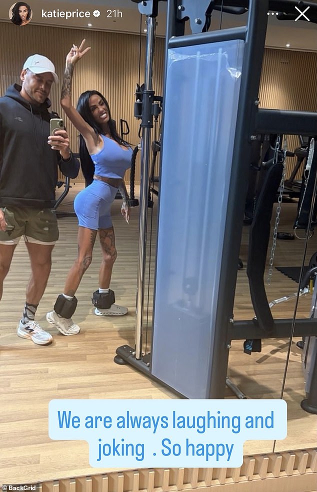 Katie Price hit the gym with her husband Lee Andrews as they posed for a mirror selfie for Instagram snaps in Dubai on Tuesday