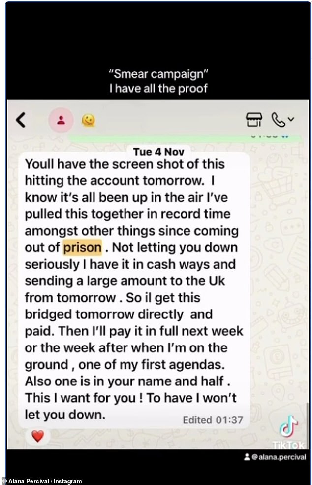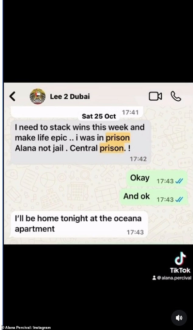 Responding to Katie’s claims that Lee has never been to prison, Alana shared alleged messages that said: ‘I need to stack wins this week and make life epic…