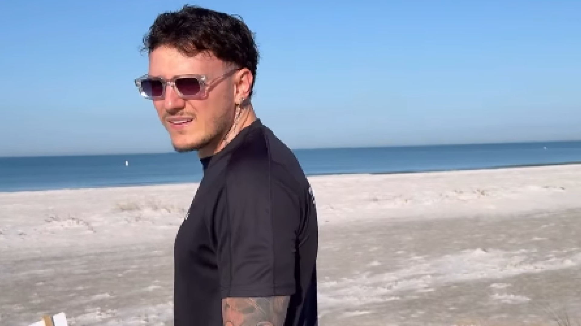 He shared a series of moving images of him standing shirtless on a beach in a pair of black swimming trunks and sunglasses.