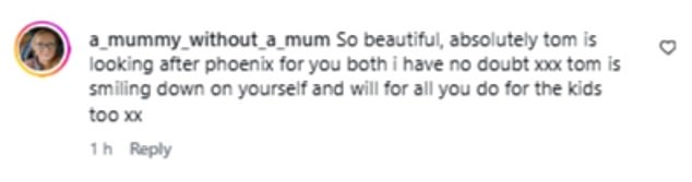 ‘So beautiful, absolutely Tom is looking after Phoenix for you both I have no doubt xxx Tom is smiling down on yourself and will for all you do for the kids too’;