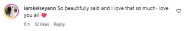 Kelsey was flooded with support from fans, as one replied: ‘So beautifully said and I love that so much- love you all’;