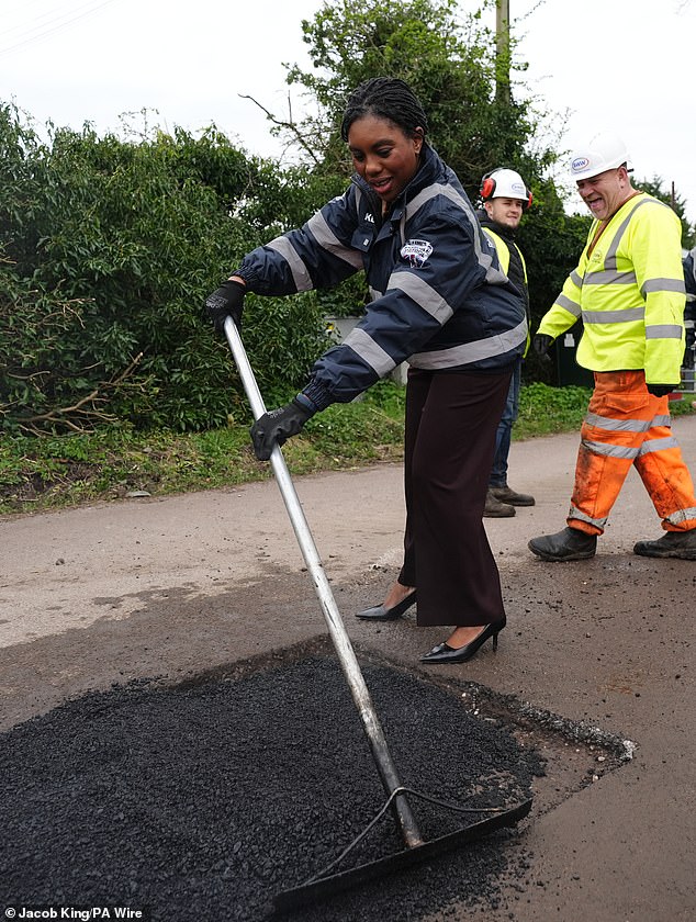 Kemi Badenoch has launched a £112.5million National Pothole Patrol plan – as she claims Britain’s roads have reached ‘breaking point’ under Labour.