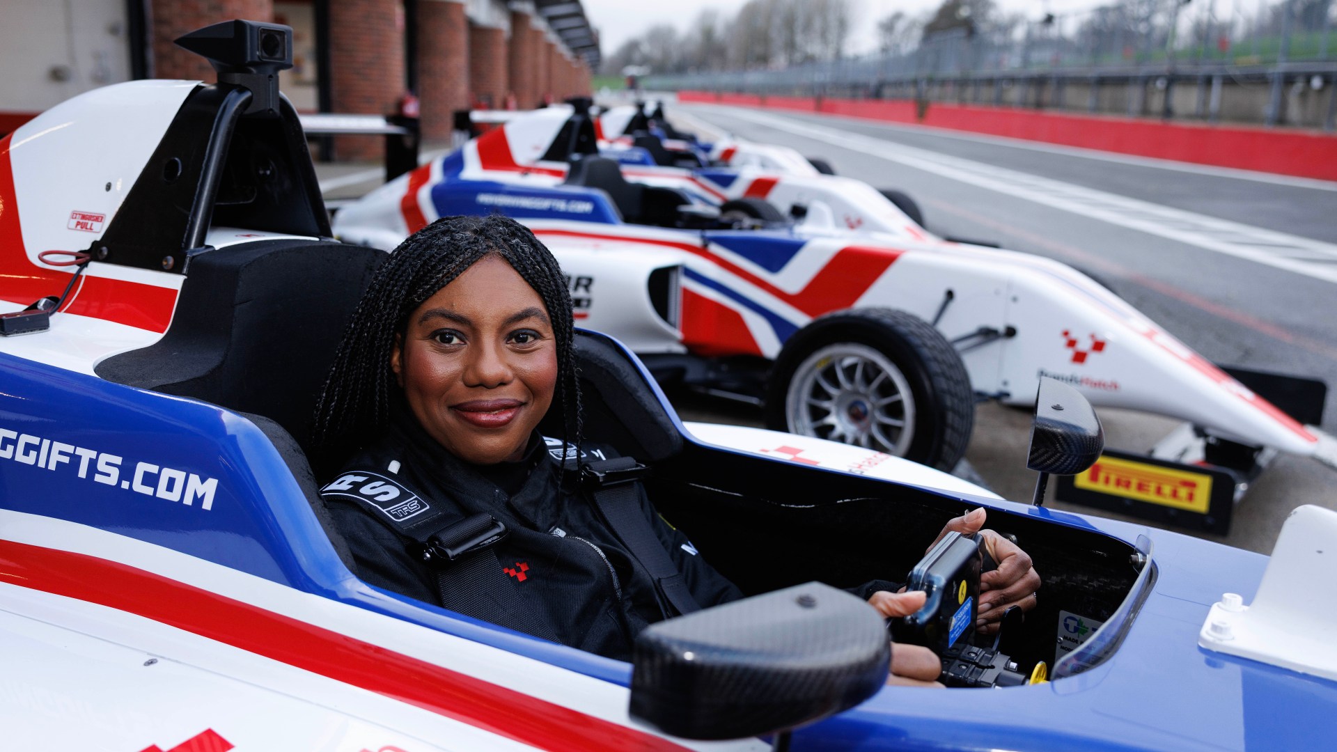 The Tory leader beamed as she put on some overalls climbing into a Formula 4 car during a visit to the Kent race track.