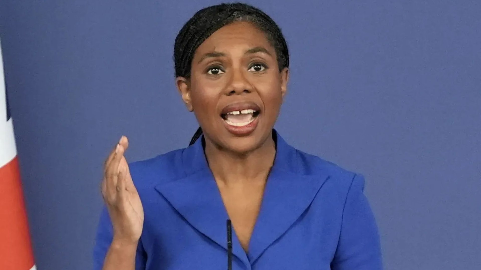 Conservative Party Leader Kemi Badenoch speaking at a podium with British flags in the background.