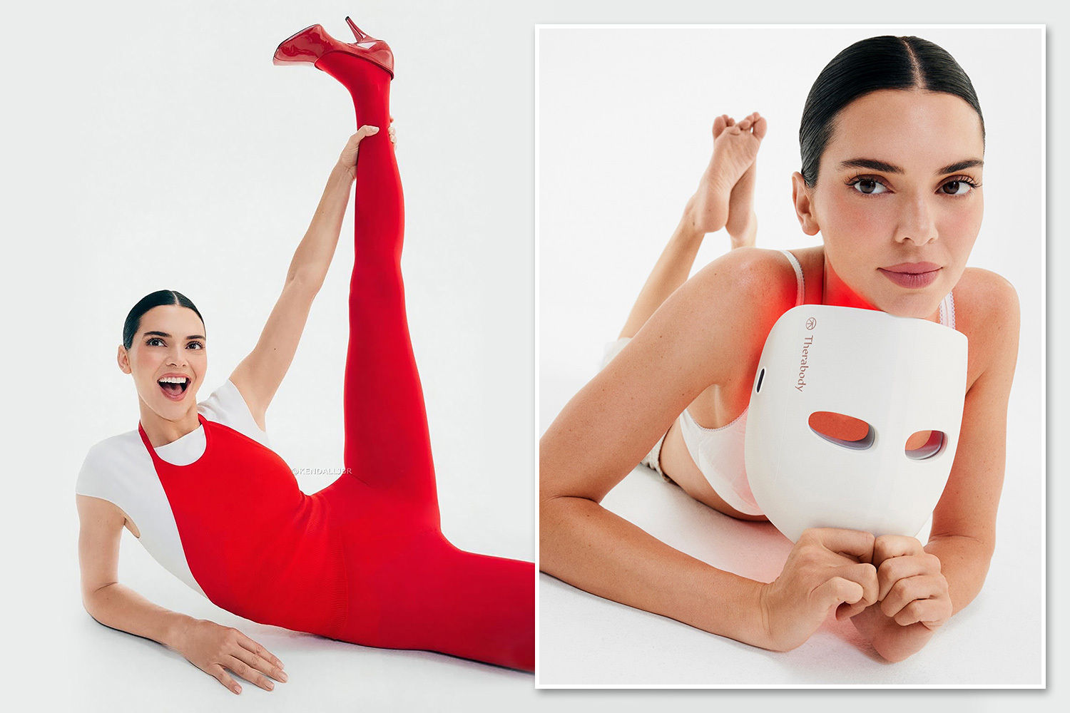 Stunning Kendall Jenner posed with her limb in the air for Therabody’s LED TheraFace Mask GloCredit: Therabody