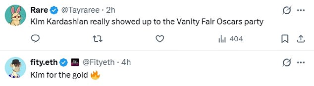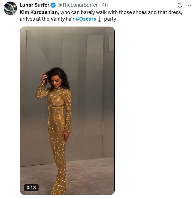 They wrote: ‘Kim Kardashian, who can barely walk with those shoes and that dress, arrives at the Vanity Fair #Oscars party; lol the walk is just crazy?;