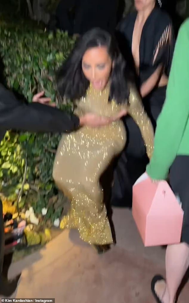 Kim was dressed to the nines in a glamorous skintight golden Gucci gown as she fell to the ground in $80 gold heels