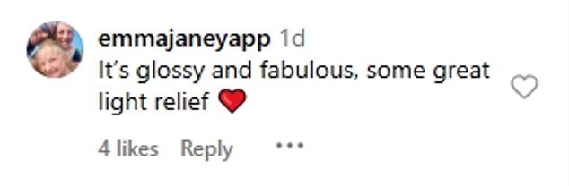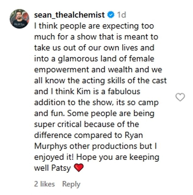 Fans in the comments gushed: ‘I think people are expecting too much for a show that is meant to take us out of our own lives and into a glamorous land of female empowerment and wealth and we all know the acting skills of the cast and I think Kim is a fabulous addition to the show, its so camp and fun. Some people are being super critical because of the difference compared to Ryan Murphys other productions but I enjoyed it! Hope you are keeping well Patsy’,