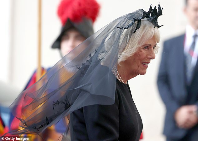 Camilla wore a Fiona Clare black silk dress, Philip Treacy mantilla and a ‘raspberry pip’ brooch in the shape of a cross, which previously belonged to the late Queen Elizabeth II.