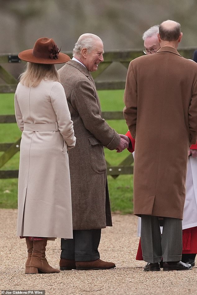 The monarch, 77, smiled as he firmly shook hands with chaplain Reverend Paul Williams ahead of the service at St Mary Magdalene Church this morning.