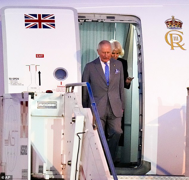 King Charles and Queen Camilla step off their plane as they arrive at Rome-Ciampino Airport ahead of their State visit to the Vatican