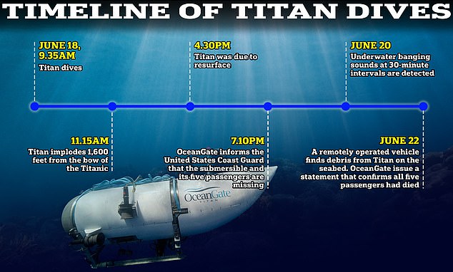 It transpired the Titan’s hull had failed nearly three hours into the dive – and imploded under the pressure of the deep ocean.