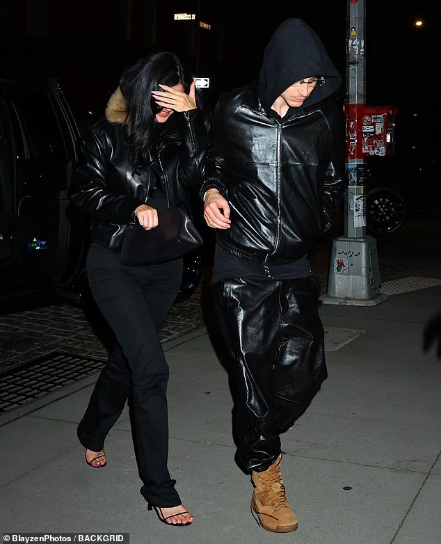 The stars had on matching black leather looks as they seemed cozy while holding hands but also shy when fans spotted the dynamic duo