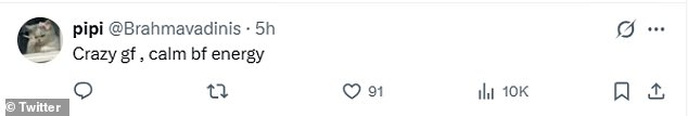 Voyeurs took to the microblogging site to pen: ‘This pic giving, ‘me and the bad b*tch i pulled by being weird’… Crazy gf , calm bf energy…
