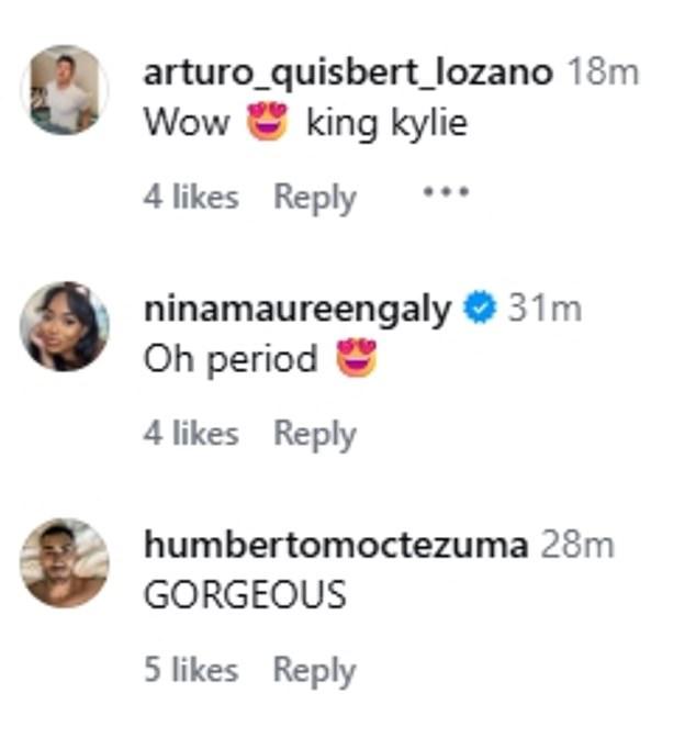 Jenner’s sister Khloe Kardashian wrote ‘My heart skipped a beat’ while pal Anastasia Karanikolaou wrote in all-caps: ‘OMG YES.’