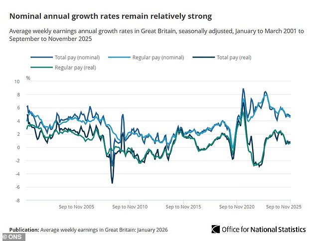 The ONS said the public sector annual growth rate is ‘affected by some public sector pay rises being paid earlier in 2025 than in 2024’, adding: ‘This has caused a base effect that has now reached its peak and will phase out over the next three months.’