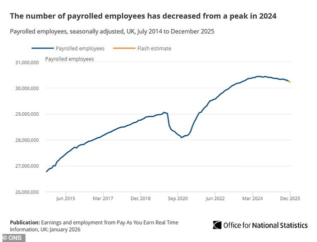 ONS director of economic statistics Liz McKeown said: ‘The number of employees on payroll has fallen again, with reductions over the last year concentrated in retail and hospitality, and reflecting ongoing weak hiring activity.’