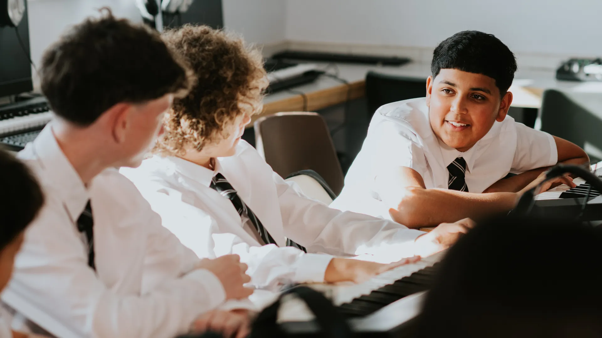Four high school boys in uniform chat while sitting in a row in a sunny music classroom.