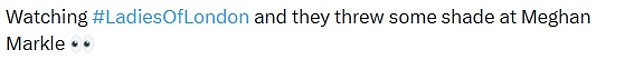 A second said: ‘Of course, they think if they mention M it will give them more traction.’ A third wrote: ‘Watching #LadiesOfLondon and they threw some shade at Meghan Markle.’