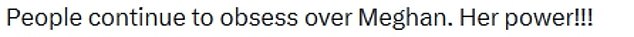 Fans have taken to social media to comment on Meghan’s mention in the show, with one writing: ‘People continue to obsess over Meghan. Her power!’