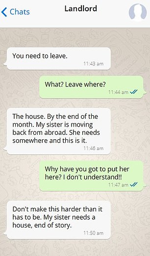 The landlord bluntly responded: ‘The house. By the end of the month. My sister is moving back from abroad. She needs somewhere and this is it.’