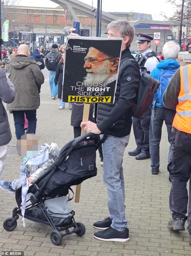 Placards criticising the US and UK governments were also on display, with one sign praising the Iranian government for ‘fighting the Epstein regime’ – an apparent reference to the antisemitic conspiracy that the paedophile Jeffrey Epstein was an Israeli spy.