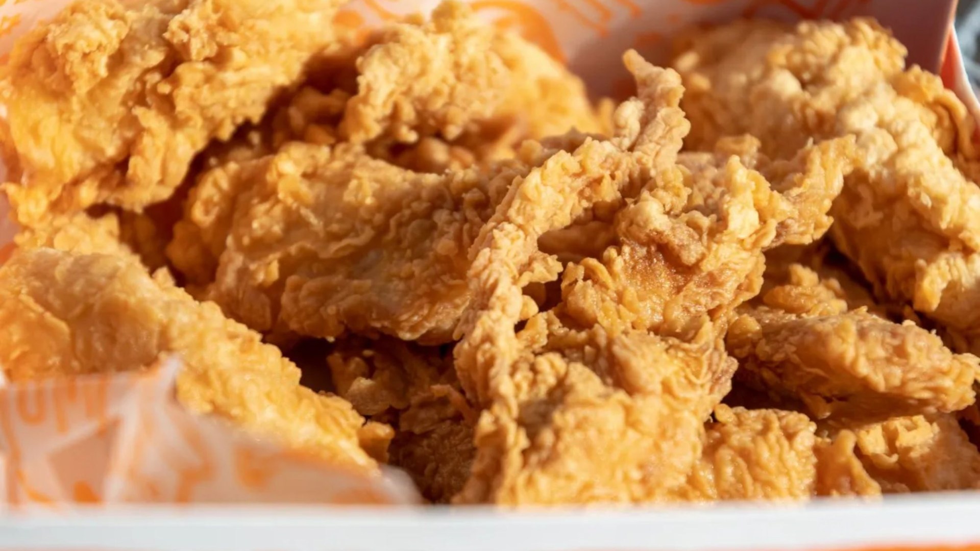 Close-up of Popeyes' crispy fried chicken tenders in a box.