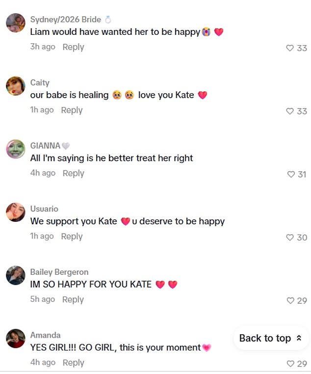 They wrote: SO HAPPY FOR YOU KATEEE; We are so happy for you Kate! We love you!; You deserve to be happy girl!; love this for you Kate Liam cheering u on;